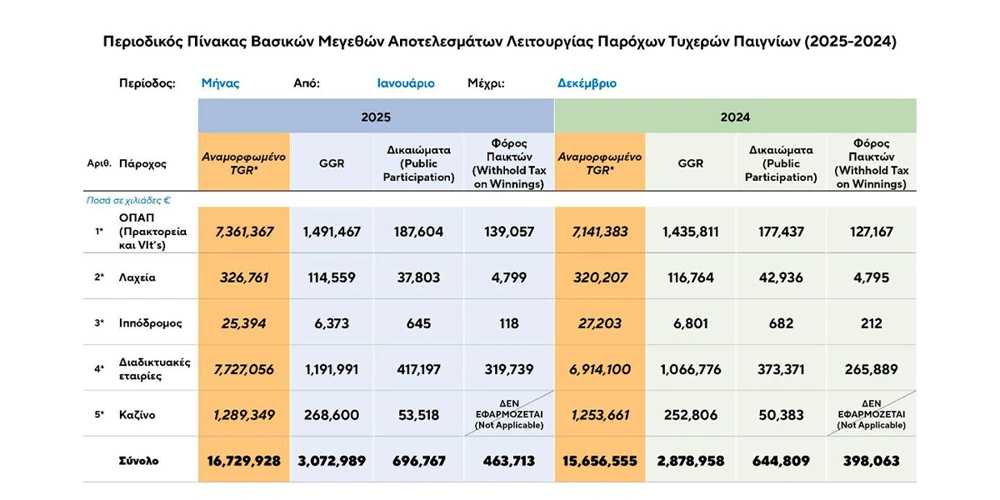 Συγκεκριμένα, μέσα στο 2025, ο αναμορφωμένος τζίρος (TGR), δηλαδή το ποσό του αθροίσματος των κερδών προ φόρων που αποδόθηκε στους παίκτες, ανήλθε στα 16.729.928 δισεκατομμύρια ευρώ. Συγκριτικά με την αντίστοιχη περίοδο του 2024, παρατηρείται αύξηση 6.9%, δηλαδή, ξεπέρασε το 1 δισεκατομμύριο στη γλώσσα των «καθαρών» αριθμών (το TGR από Ιανουάριο - Δεκέμβριο 2024 ήταν 15.656.555 δις).